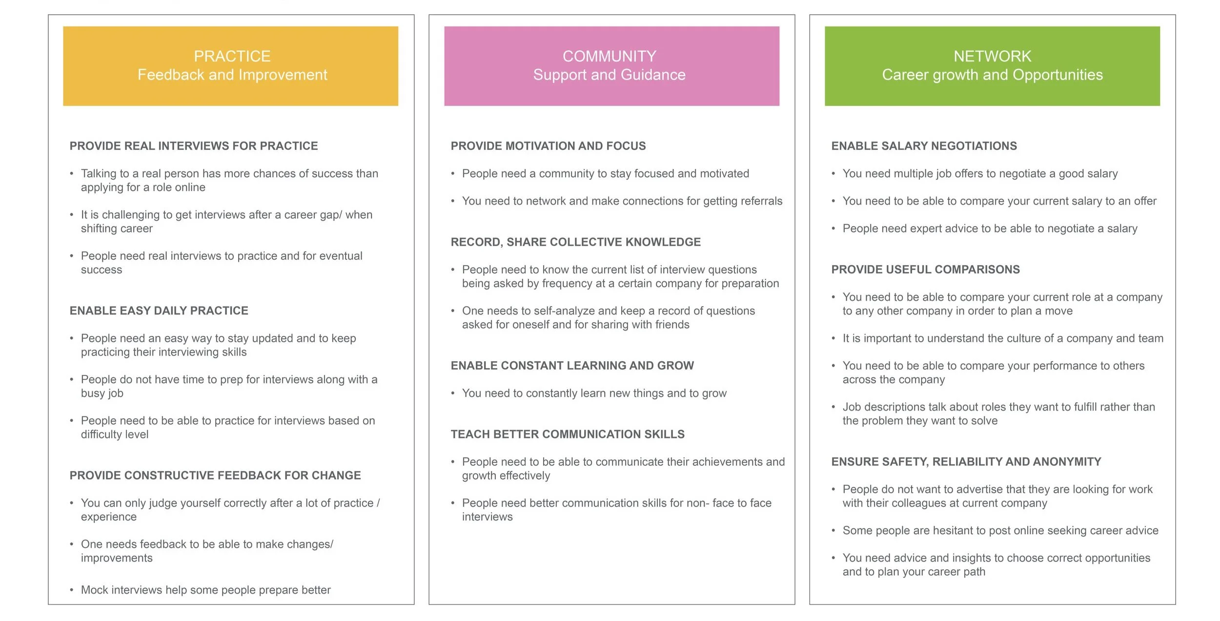 During competitive research, it was found that there is an opportunity for an expert service that provides both interview practice and career advice to professionals in the tech industry. Based on this idea I created a research plan which included a survey and three in-depth ethnographic interviews. The survey had 23 responses from tech professionals such as Designers, Researchers, Marketing and HR. Among the three Interview participants, one was a Software Developer at Facebook, another was a recent mom trying to get back to a program manager role after a pregnancy pause, and the last was a senior sales executive at a tech company.