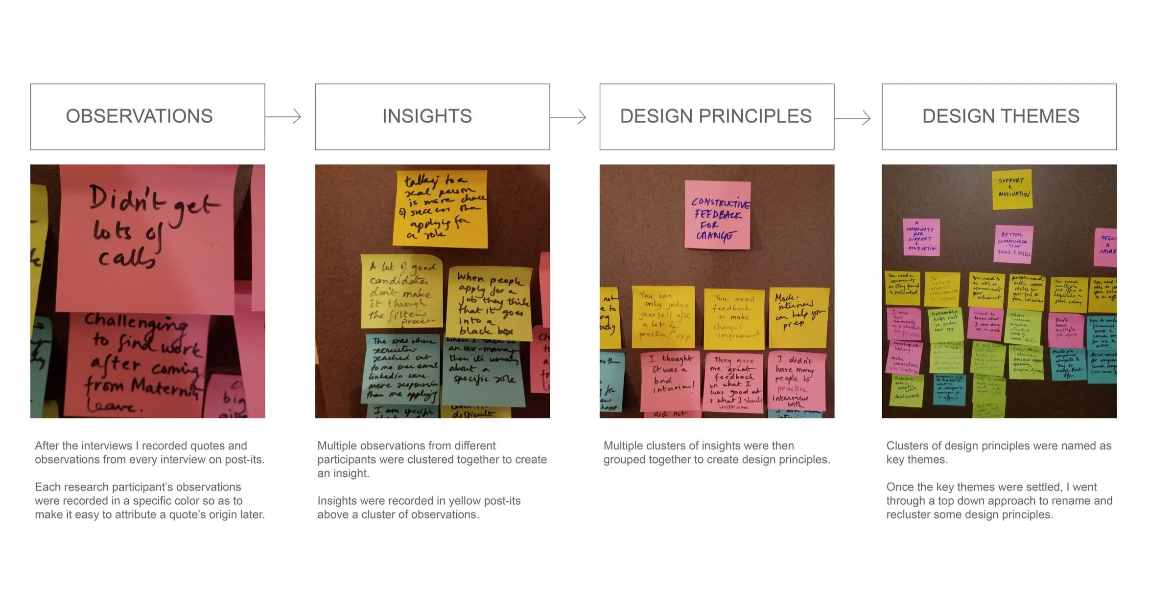 Using the affinity clustering method I derived Insights from observations and then grouped these Insights further into Design Principles and Themes.