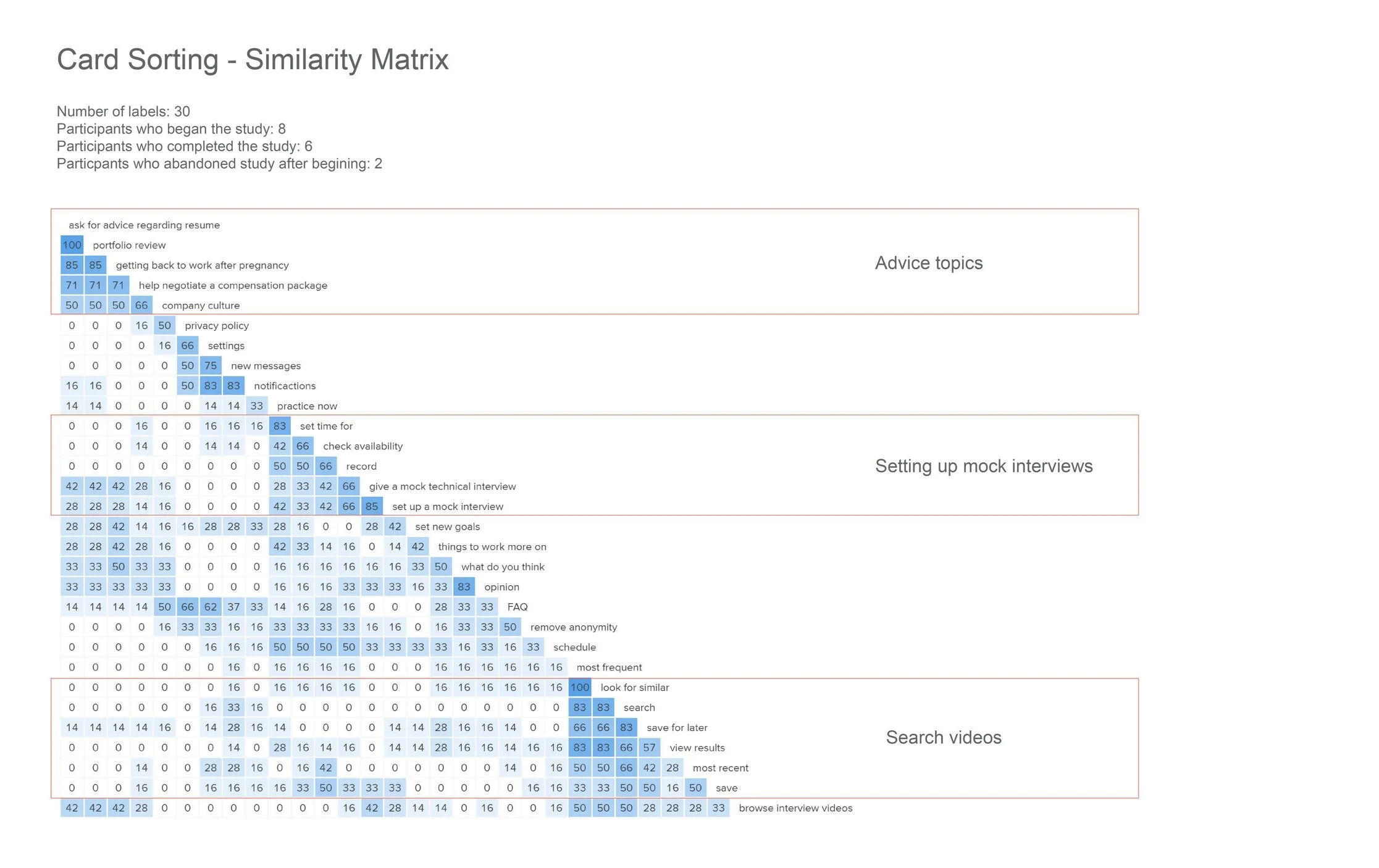 I used Optimal Sort to create an open card sorting exercise with 30 labels. Using the Similarity Matrix I got three main themes- Advice topics, Setting up mock interviews, and Search Videos.