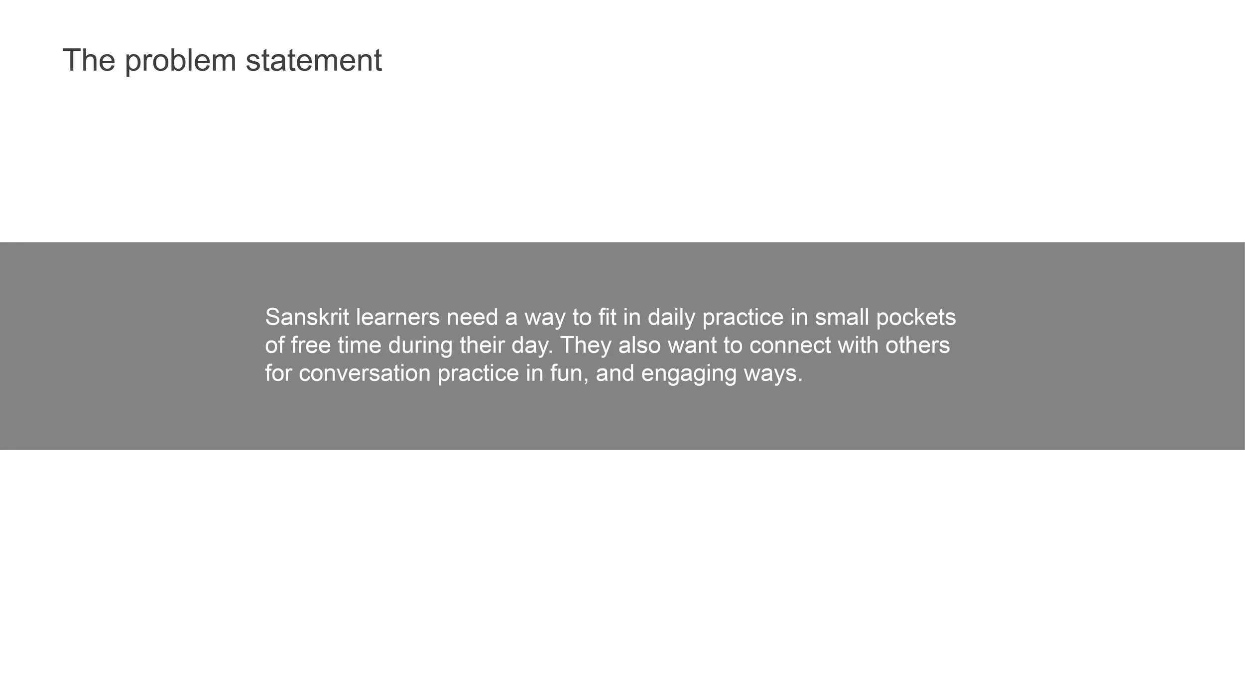 Next, I created research questions and an interview script for 3 ethnographic interviews. Two of the interview participants were recruited from Samskrita Bharati, and one was recruited from a Sanskrit learners’ Facebook group. Based on the user research findings, I created three proto-personas.