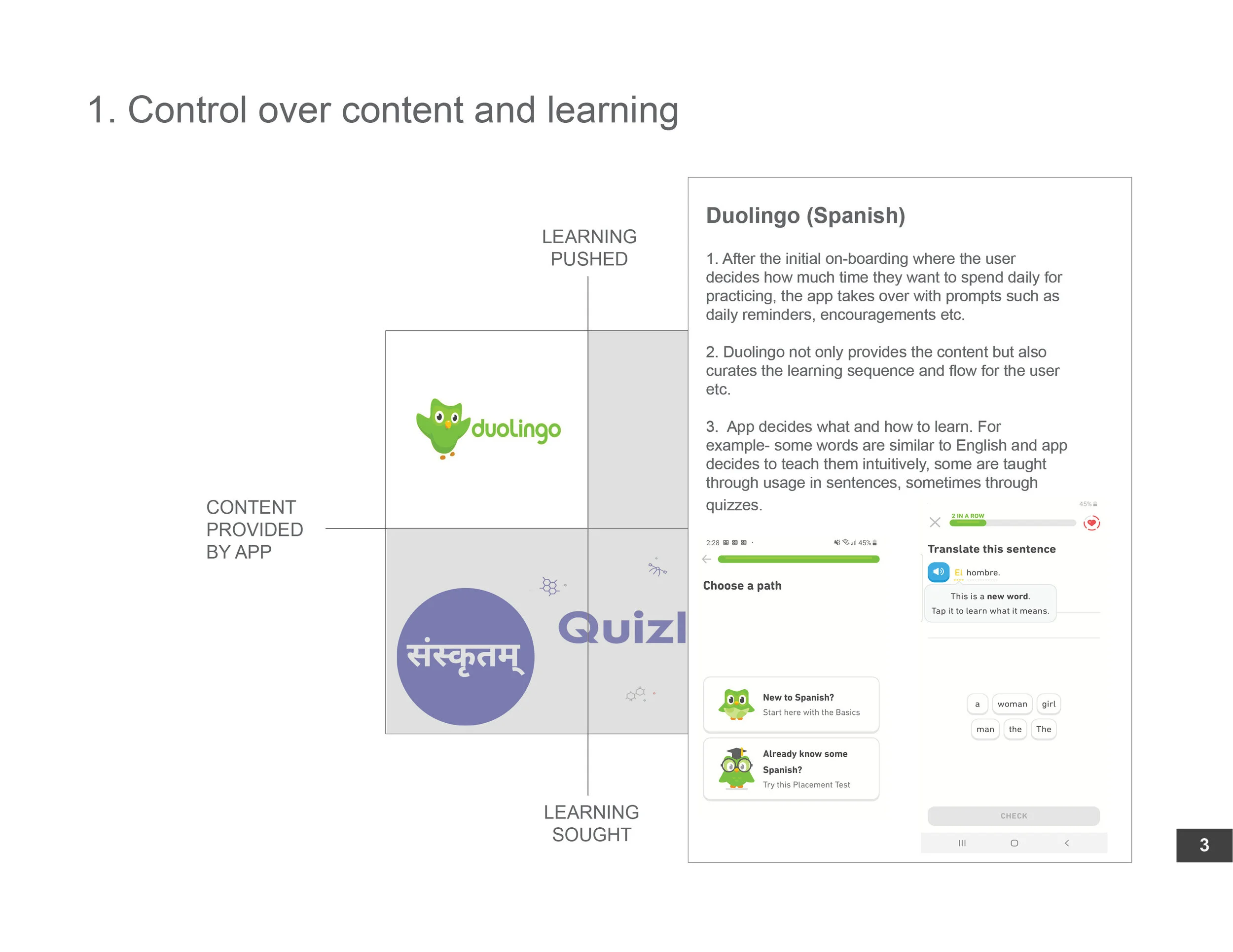 I compared three apps in the vocabulary building market: Duolingo- which did not have a Sanskrit learning option but had an extremely fun and intuitive user experience, Quizlet- which is a card based vocabulary building model where most of the content was generated by the users themselves, and lastly Sanskrit Flashcards- where words on flashcards were clustered into categories and people simply memorized the definition by repetition.